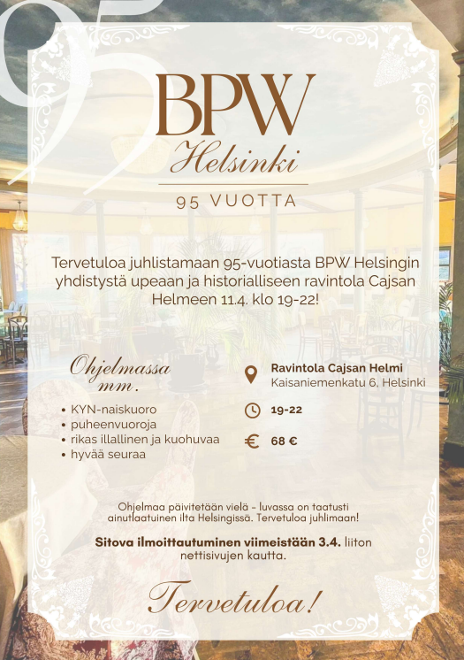 BPW Finland järjestää vuosikokouksensa 2026 Helsingissä, Scandic Simonkentässä. 11.00 buffetlounas 12.00 vuosikokous kokouskahvit kokouksen lomassa 16.00 kokous päättyy 16.30 vierailu MINNA MINNA…
