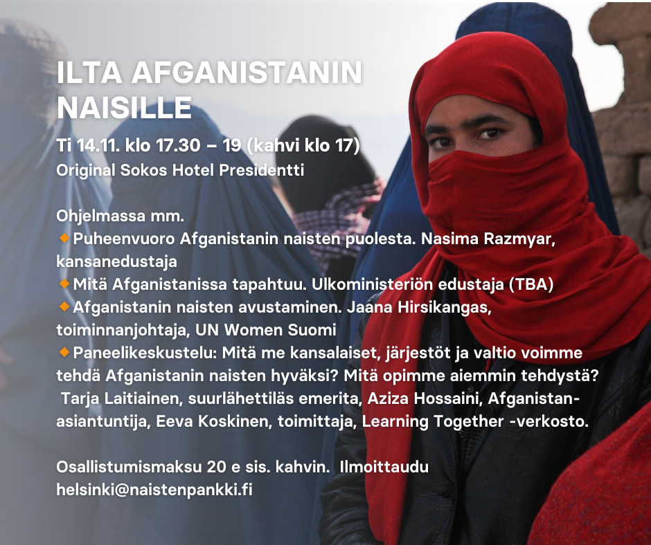 Ilmoittautumiset 30.10.2023 mennessä helsinki@naistenpankki.fi, viestin aiheeksi Afganistan sekä kerro, oletko vapaaehtoisena mukana jommassa kummassa järjestävässä organisaatiossa (Naisten Pankki, BPW) tai vastaavassa järjestössä (missä). Vahvistusviestin saatuasi maksa 20 euroa Naisten Pankki Helsingin tilille FI80 1745 3000 1728 27, viite 1656.