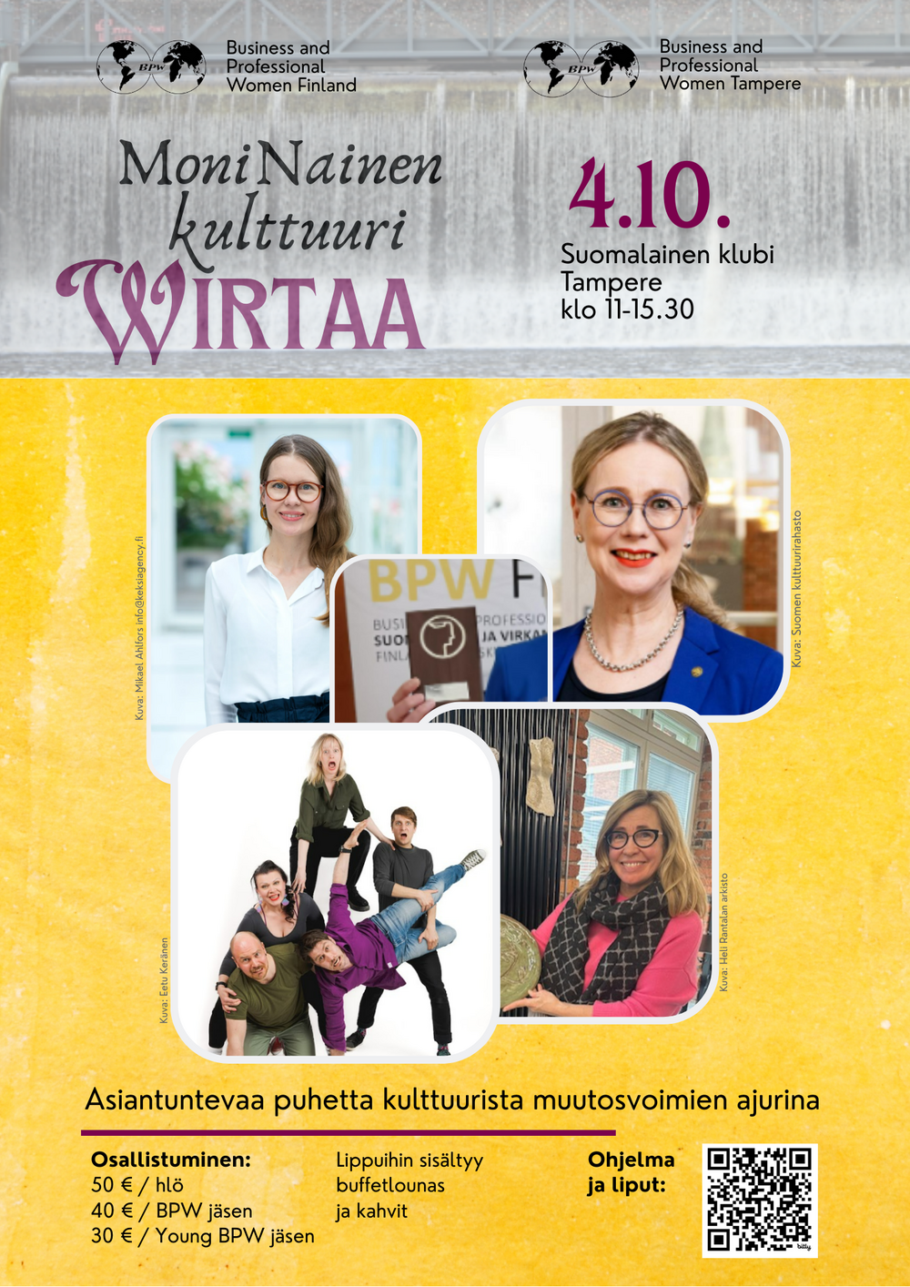 Tervetuloa viettämään yhteistä päivää Tampereen Suomalaiselle klubille 4.10. klo 11.00-15.30! Ohjelma: 11–12 Buffetlounas 12.00–12.10 Tervetuloa Anne Gustafsson-Pesonen, BPW Finland puheenjohtaja…